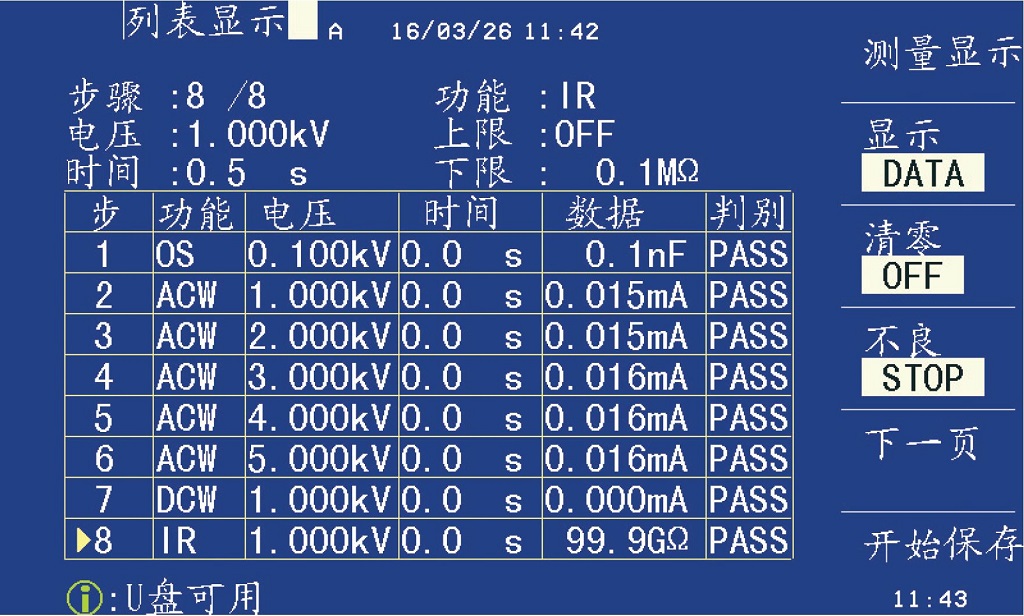 在多步測量時,傳統的耐壓儀往往只能看到當前的測試結果, 客戶無法查看前面幾步的測試結果。ZX9501系列耐壓儀具有列表掃描顯示功能,客戶可以很方便地查看各步的測試結果,也可以很方便地比較被測件在不同測試條件下的測試結果。